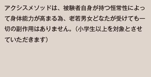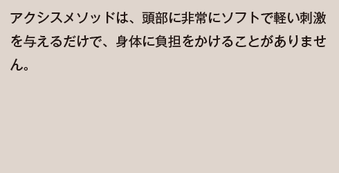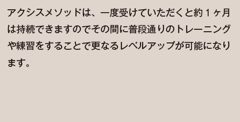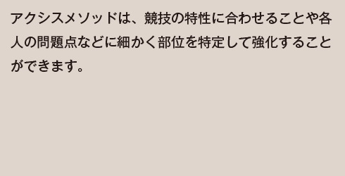 アクシスメソッドとは、頭部に軽い刺激を与えるだけで神経のブロックを解除することにより潜在的な能力を高め、パワーやスピード・柔軟性と連動性という機能が開花するため飛躍的にパフォーマンスが向上します。